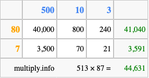 That's all there is to it! As you can see from the box above, the answer to 513 times 87 using the box method is 44,631.