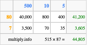 That's all there is to it! As you can see from the box above, the answer to 515 times 87 using the box method is 44,805.