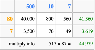 Below is an illustration showing you how to calculate 517 times 87 using the box method, using the instructions above.