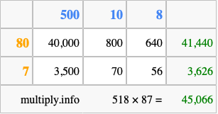 Finally, we add up all the sums we found in step 3 to get our final answer to 518 times 87.