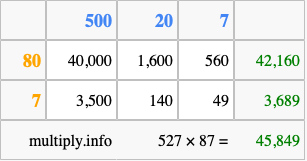 Below is an illustration showing you how to calculate 527 times 87 using the box method, using the instructions above.