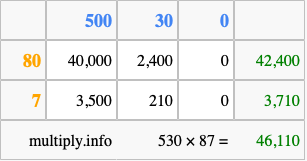 Below is an illustration showing you how to calculate 530 times 87 using the box method, using the instructions above.