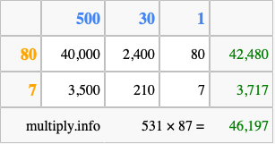 That's all there is to it! As you can see from the box above, the answer to 531 times 87 using the box method is 46,197.