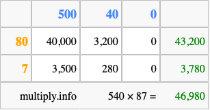 Finally, we add up all the sums we found in step 3 to get our final answer to 540 times 87.