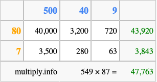 That's all there is to it! As you can see from the box above, the answer to 549 times 87 using the box method is 47,763.