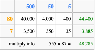 Below is an illustration showing you how to calculate 555 times 87 using the box method, using the instructions above.