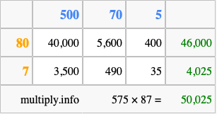 That's all there is to it! As you can see from the box above, the answer to 575 times 87 using the box method is 50,025.