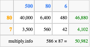 Finally, we add up all the sums we found in step 3 to get our final answer to 586 times 87.