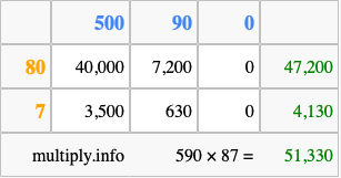 Finally, we add up all the sums we found in step 3 to get our final answer to 590 times 87.