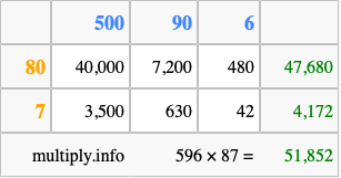 Below is an illustration showing you how to calculate 596 times 87 using the box method, using the instructions above.