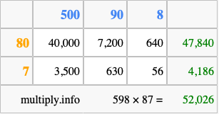 Finally, we add up all the sums we found in step 3 to get our final answer to 598 times 87.