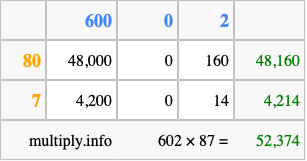 Finally, we add up all the sums we found in step 3 to get our final answer to 602 times 87.
