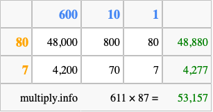 Finally, we add up all the sums we found in step 3 to get our final answer to 611 times 87.