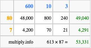 Finally, we add up all the sums we found in step 3 to get our final answer to 613 times 87.