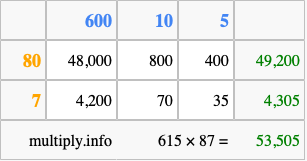 Finally, we add up all the sums we found in step 3 to get our final answer to 615 times 87.