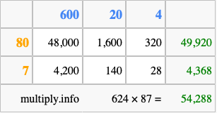 Finally, we add up all the sums we found in step 3 to get our final answer to 624 times 87.