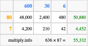 That's all there is to it! As you can see from the box above, the answer to 636 times 87 using the box method is 55,332.