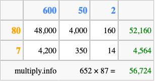 Finally, we add up all the sums we found in step 3 to get our final answer to 652 times 87.
