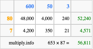 Finally, we add up all the sums we found in step 3 to get our final answer to 653 times 87.