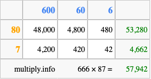 Finally, we add up all the sums we found in step 3 to get our final answer to 666 times 87.