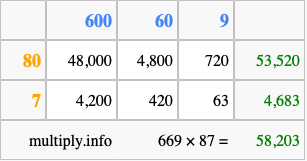 That's all there is to it! As you can see from the box above, the answer to 669 times 87 using the box method is 58,203.