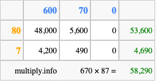 That's all there is to it! As you can see from the box above, the answer to 670 times 87 using the box method is 58,290.