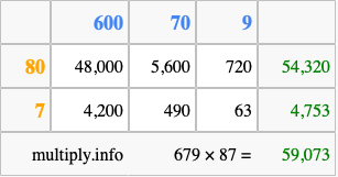 Finally, we add up all the sums we found in step 3 to get our final answer to 679 times 87.