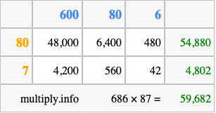 Finally, we add up all the sums we found in step 3 to get our final answer to 686 times 87.