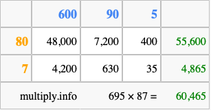 Finally, we add up all the sums we found in step 3 to get our final answer to 695 times 87.