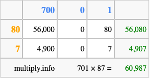 That's all there is to it! As you can see from the box above, the answer to 701 times 87 using the box method is 60,987.