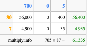 Finally, we add up all the sums we found in step 3 to get our final answer to 705 times 87.