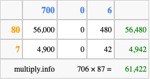 That's all there is to it! As you can see from the box above, the answer to 706 times 87 using the box method is 61,422.