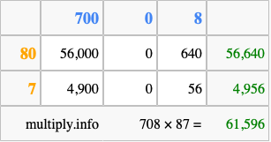 That's all there is to it! As you can see from the box above, the answer to 708 times 87 using the box method is 61,596.