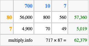 Finally, we add up all the sums we found in step 3 to get our final answer to 717 times 87.