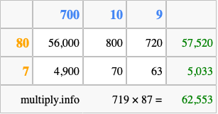 Finally, we add up all the sums we found in step 3 to get our final answer to 719 times 87.