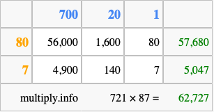 Finally, we add up all the sums we found in step 3 to get our final answer to 721 times 87.