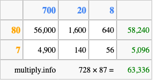 Finally, we add up all the sums we found in step 3 to get our final answer to 728 times 87.