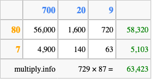 Finally, we add up all the sums we found in step 3 to get our final answer to 729 times 87.