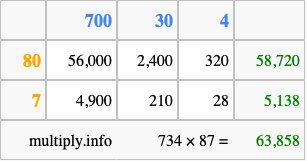 Finally, we add up all the sums we found in step 3 to get our final answer to 734 times 87.