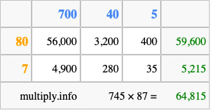 Finally, we add up all the sums we found in step 3 to get our final answer to 745 times 87.