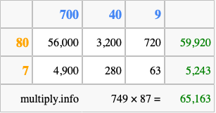 That's all there is to it! As you can see from the box above, the answer to 749 times 87 using the box method is 65,163.