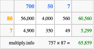 Finally, we add up all the sums we found in step 3 to get our final answer to 757 times 87.