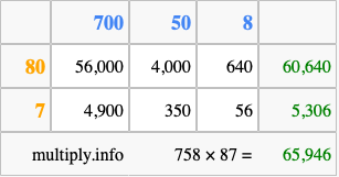 Finally, we add up all the sums we found in step 3 to get our final answer to 758 times 87.