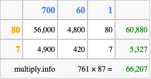 Finally, we add up all the sums we found in step 3 to get our final answer to 761 times 87.