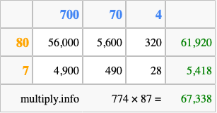 That's all there is to it! As you can see from the box above, the answer to 774 times 87 using the box method is 67,338.
