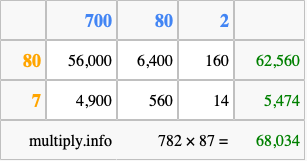 Finally, we add up all the sums we found in step 3 to get our final answer to 782 times 87.