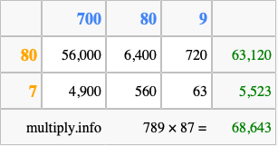 That's all there is to it! As you can see from the box above, the answer to 789 times 87 using the box method is 68,643.