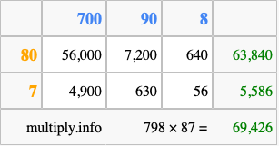 Finally, we add up all the sums we found in step 3 to get our final answer to 798 times 87.