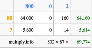 That's all there is to it! As you can see from the box above, the answer to 802 times 87 using the box method is 69,774.