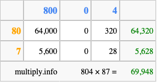 Finally, we add up all the sums we found in step 3 to get our final answer to 804 times 87.